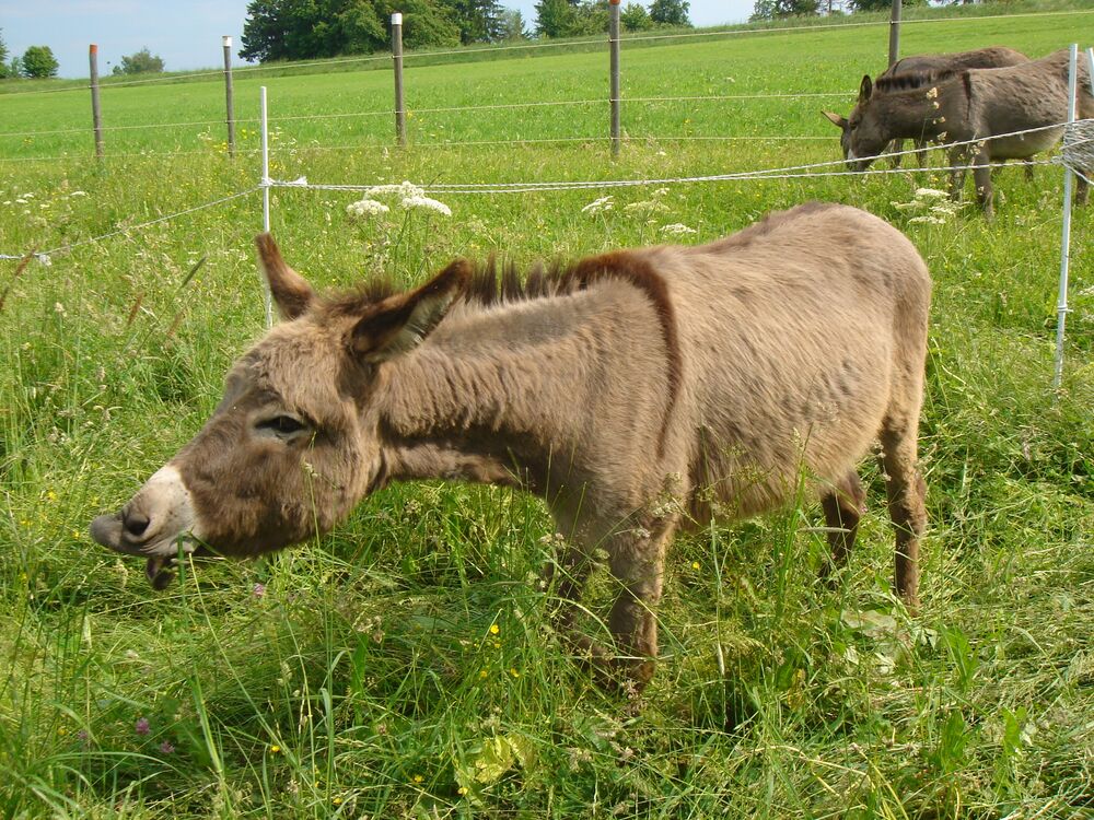 Wenn wir unser Dorf Dettingen in Richtung Westen verlassen finden wir direkt zur Farm. Dort warten sie schon, meine drei grauen Gesellen. Sie wirken wie angewurzelt auf der weitläufigen Koppel und scheinen sich auf unseren Besuch zu freuen. Esel sind sehr gesellige Tiere. Sie mögen die Berührung von uns Menschen.