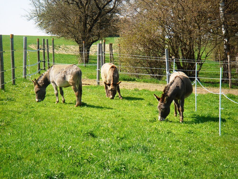 Wenn wir unser Dorf Dettingen in Richtung Westen verlassen finden wir direkt zur Farm. Dort warten sie schon, meine drei grauen Gesellen. Sie wirken wie angewurzelt auf der weitläufigen Koppel und scheinen sich auf unseren Besuch zu freuen. Esel sind sehr gesellige Tiere. Sie mögen die Berührung von uns Menschen.